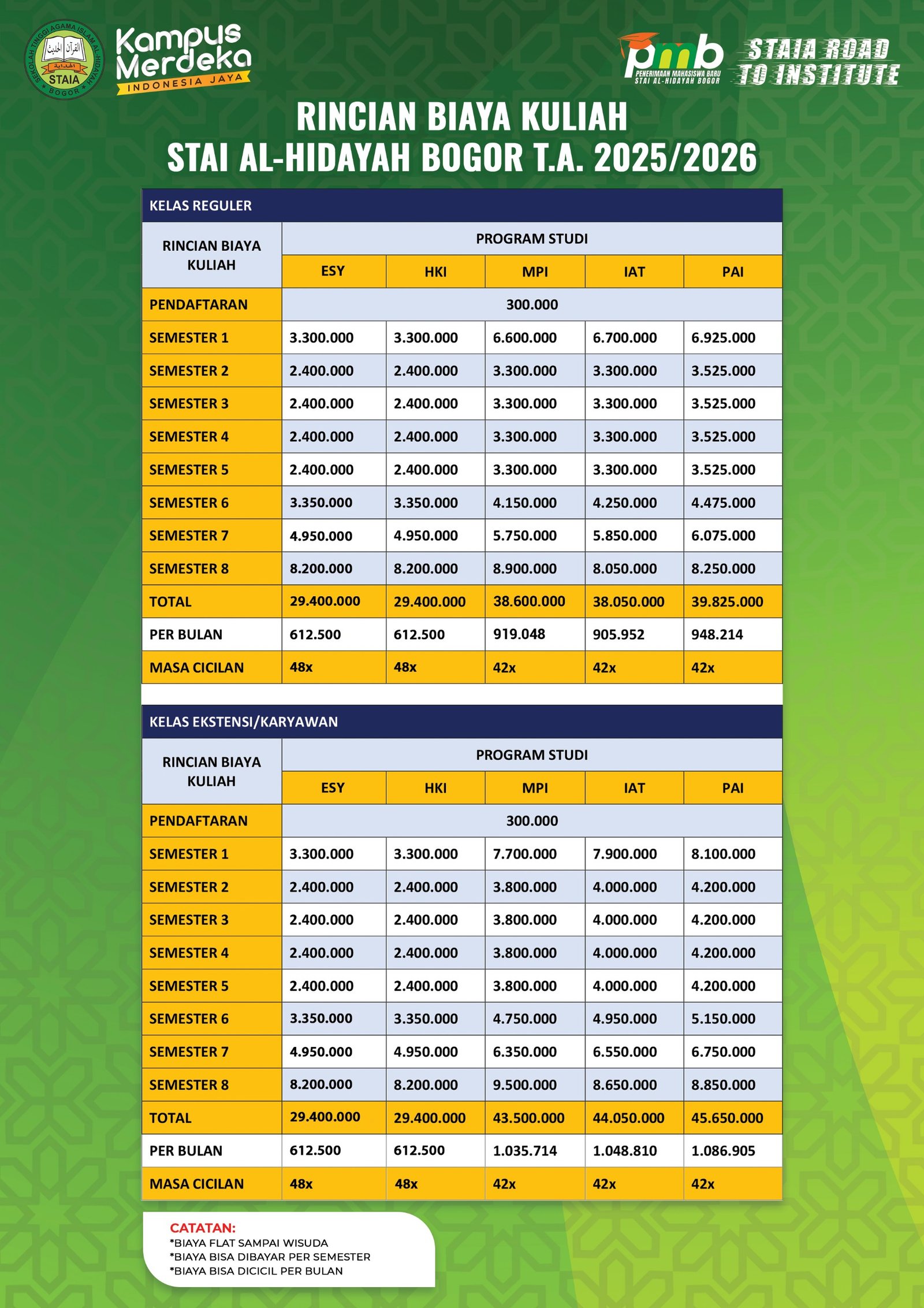 INFORMASIINFORMASI PMB BrosurProgram Sarjana T.A. 2026-2027 Download/Lihat Brosur BrosurProgram Magister T.A. 2026-2027 Download/Lihat Brosur BiayaProgram Sarjana T.A. 2025-2026 Download/LihatRincian Biaya BiayaProgram Magister Institut Al-Hidayah Bogor Download/LihatRincian Biaya Info Beasiswa Selengkapnya